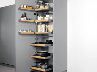 Dovoljan je jedan potez rukom i vrata ormarića sa okovom Pleno Plus se otvaraju. Sve police, uključujući i gornje, istovremeno se izvlače vani i cijeli sadržaj je odmah vidljiv. Police se impresivno glatko izvlače, toliko lako da ih može i dijete otvoriti. Ipak, da dohvati gornje police, potrebno je i da još malo naraste. Svi ostali korisnici ergonomski lako mogu pristupiti svojim zalihama. Budući da je najviša polica podijeljena, i na njoj možete lijepo pohraniti određene predmete ili namirnice. Pored toga, u vratima ormara su također police - poput onih kod hladnjaka. Na gornjim policama ormarića mogu se staviti veće vrećice i zalihe, na donjim posuđe i pribor za jelo, a na polici vrata manje zalihe, kao što su začini i zdjelice.