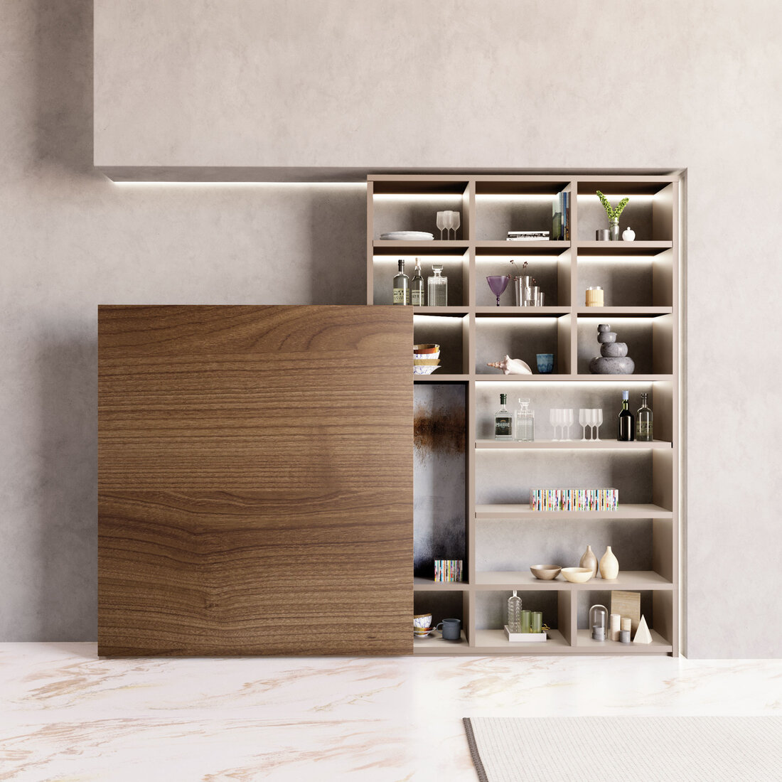 Sistem Magic Living dizajniran je tako da bude potpuno nevidljiv nakon ugradnje — gornji vodilni mehanizam, klizni elementi i nosači nestaju iz vidnog polja, ostavljajući samo elegantnu, ravnu stijenku i vrata koja se glatko i tiho otvaraju i zatvaraju. Ovaj minimalistički pristup omogućuje maksimalan fokus na materijal vrata i estetiku prostora, umjesto na funkcionalnu tehniku koja se koristi.