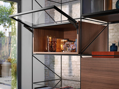 Namještaj – bilo ugradbeni ormar, vitrina ili regal treba biti u fokusu posmatrača. Niko ne želi vidjeti sofisticiranu tehnologiju sa spremnicima snage sprijeda, integriranim graničnicima otvaranja i zaustavljivačima straga. Zbog svega toga, Blum je svoj integrirani preklopni okov sakrio u zid stranice. Čak ni kod primjene na staklenim frontama, nećete primijetiti vidljive dijelove Aventosa HKI u elegantnoj onyx crnoj boji.