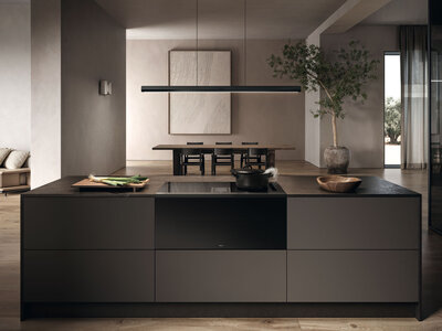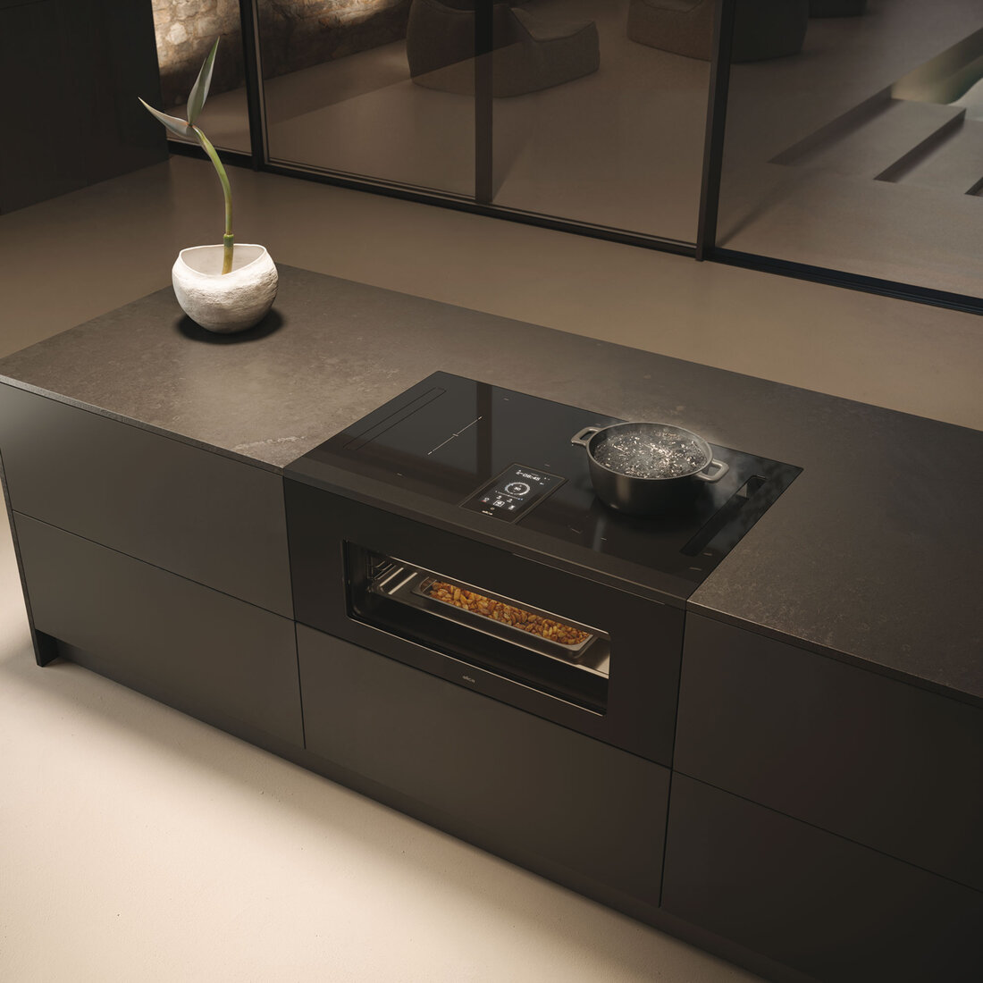 Dizajn uređaja krši pravila kategorije proizvoda kombinirajući, po prvi put ikada, ploču, pećnicu i integriranu napu u jednom uređaju standardne veličine (90x36 cm). Ova jedinstvena karakteristika omogućuje vam savršenu integraciju u kuhinjske elemente, maksimalno iskorištavanje prostora i dodatno isticanje dizajna vaše kuhinje. Estetski dojam? Izuzetan – pogotovo zahvaljujući izrazito linearnim i kontinuiranim površinama od crnog stakla, potpuno bez ručki ili prekidača.