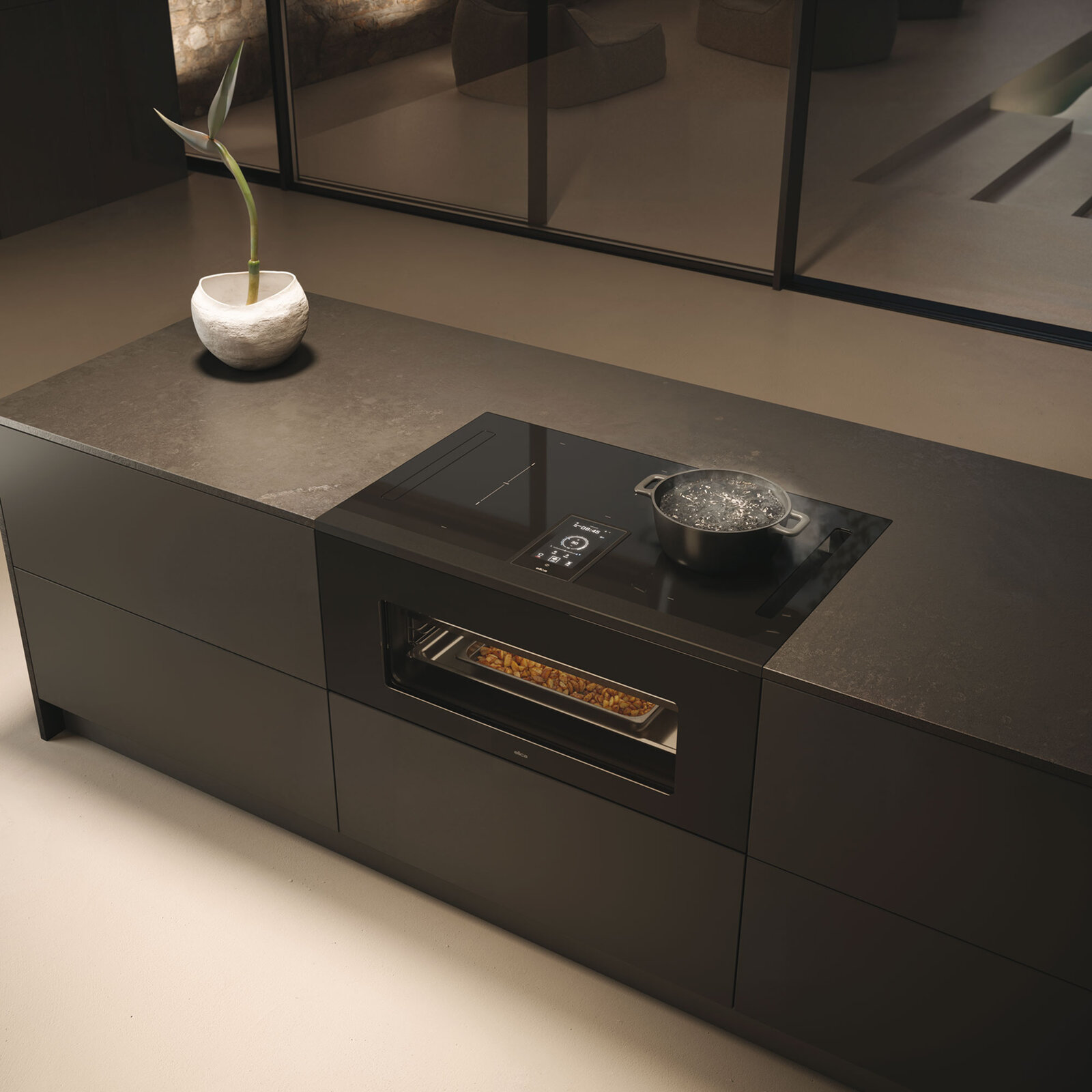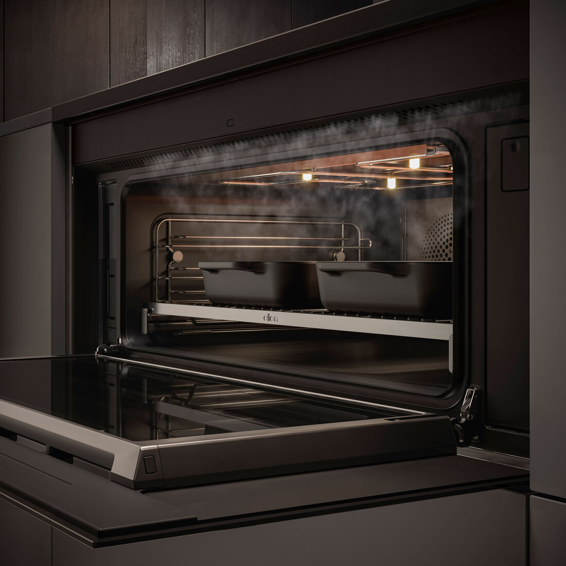 LHOV je prvi All-in-One uređaj na tržištu, a njegove inovacije govore same za sebe. Njegov izrazito linearni dizajn s crnim staklom spaja nenadmašnu estetiku i izvedbu: savršeno se uklapa s kuhinjskim elementima i nudi inovativne karakteristike, različite načine i zone kuhanja, nevjerovatan zaslon osjetljiv na dodir – kako bi ispunio svaku vašu potrebu. I na kraju, ali ne manje važno: njegov najnoviji sistem uvlačenja pare može uhvatiti pare i mirise ne samo s ploče za kuhanje, već – po prvi put – i iz pećnice.