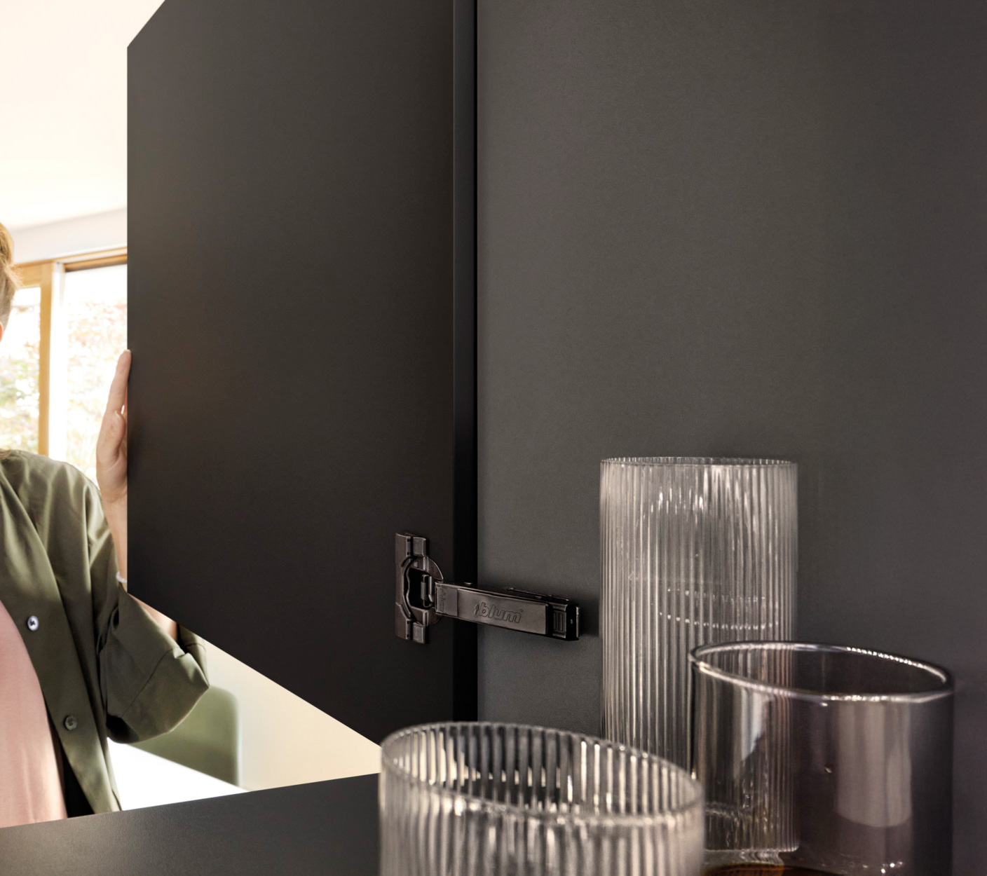 Tamni namještaj je u trendu – ne samo vani nego i unutra. S Blum spojnicama u onyx crnoj boji ovaj dizajnerski zahtjev ispunjava se do najsitnijih detalja. Tamna varijanta boje nenametljivo se uklapa u unutrašnjost namještaja ili svjesno postavlja estetske naglaske. Rezultat: skladna cjelina uz punu tehničku učinkovitost.