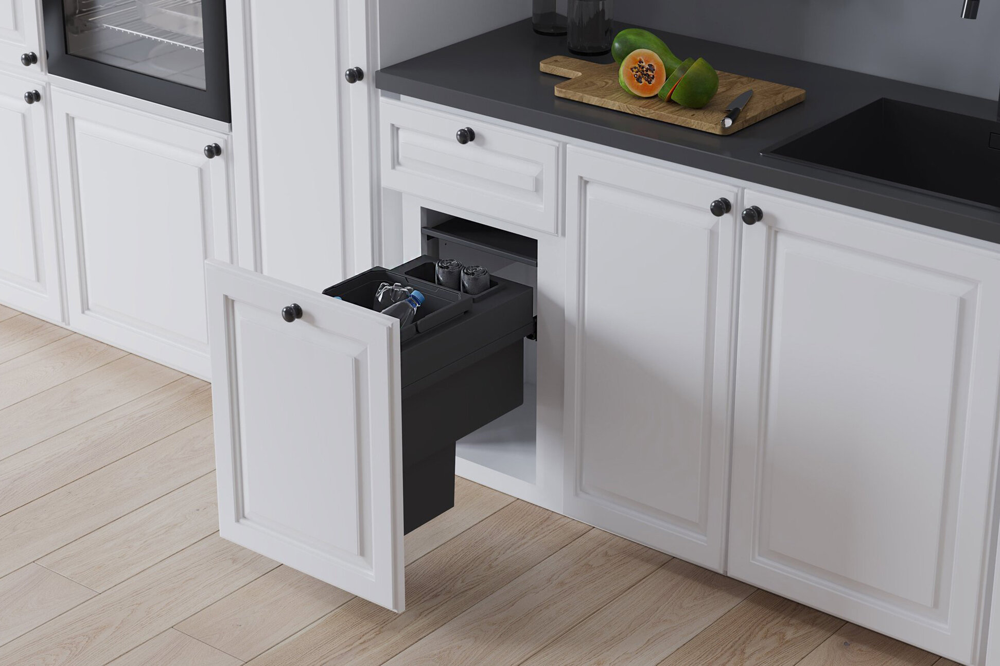 Opremljen vodilicama, samozatvaranjem i ublaživačem, smješta velike spremnike čak i u male kuhinjske elemente. Sistem se može koristiti direktno ispod radne ploče što omogućava olakšano odlaganje otpa