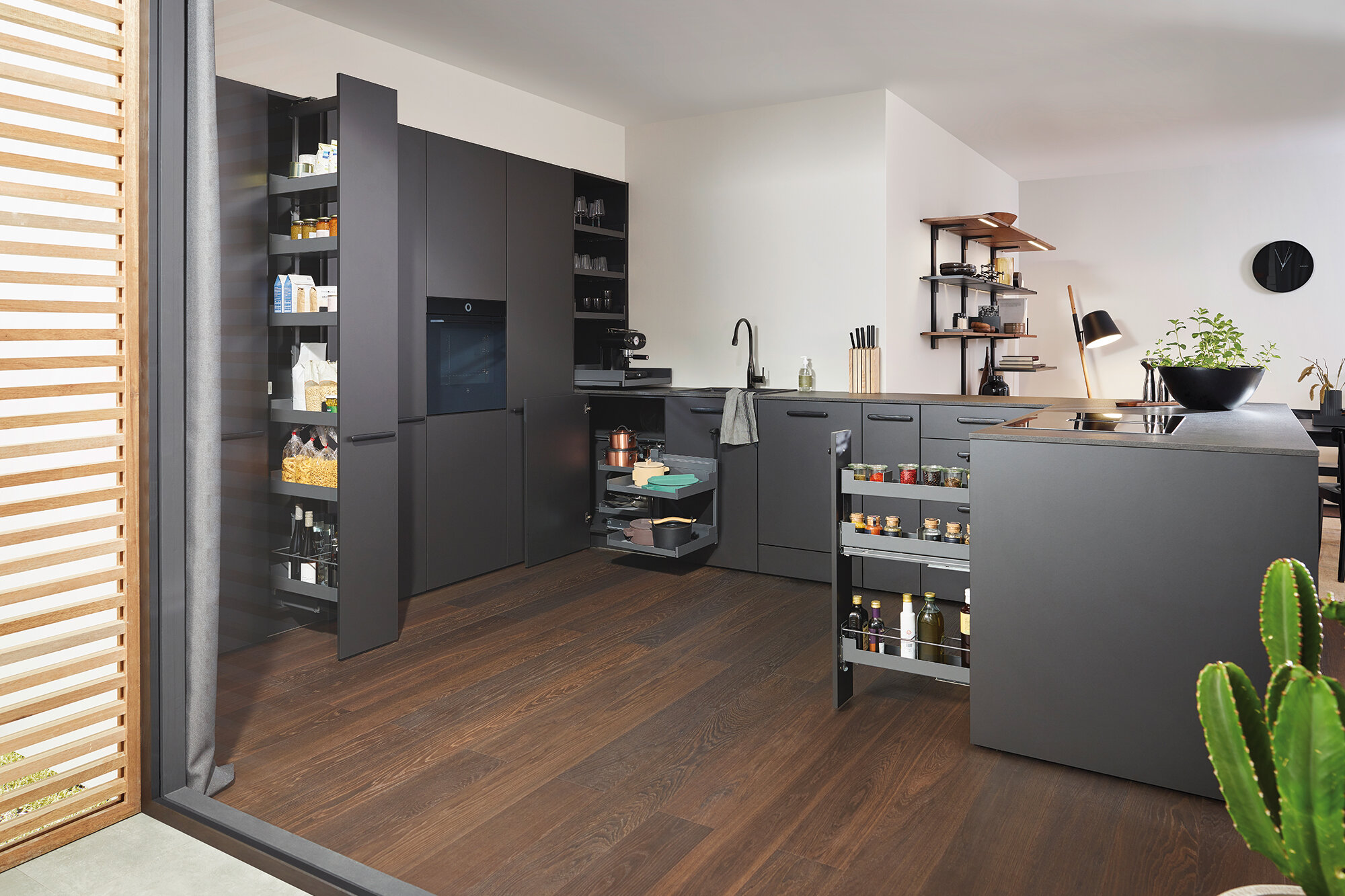 Dovoljan je jedan potez rukom i vrata ormarića sa okovom Pleno Plus se otvaraju. Sve police, uključujući i gornje, istovremeno se izvlače vani i cijeli sadržaj je odmah vidljiv. Police se impresivno g
